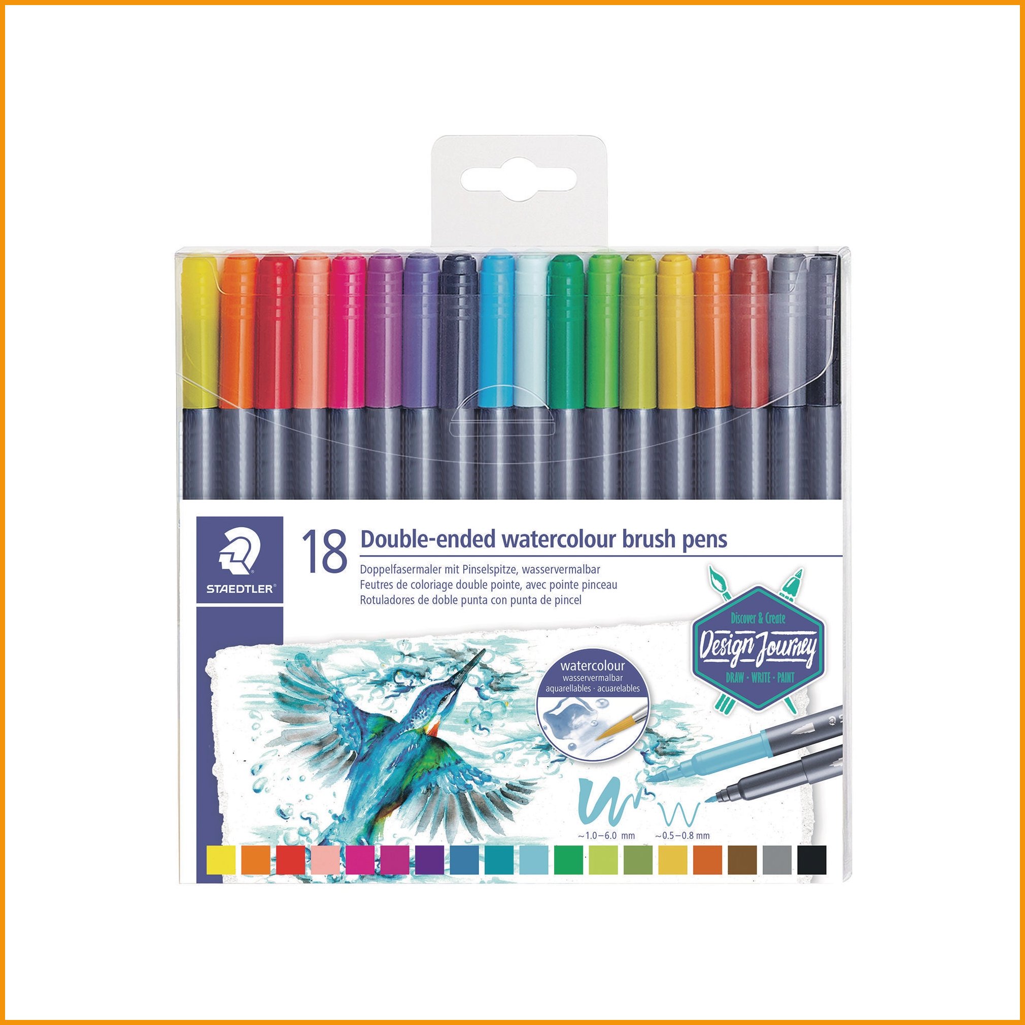 Staedtler marsgraphic kaksipäistä sivellinkynää voidaan käyttää vesivärien tapaan vesiliukoisen värin ansiosta. se sopii erinomaisesti esimerkiksi vaihteleviin viivoihin, varjostuksiin, yksityiskohtaisiin töihin, mangoihin ja kauniisiin yksityiskohtiin. kynän jälkeä voidaan häivyttää myös siveltimellä. kartiomaisen sivellinkärjen jälki on noin 1,0 - 6,0 mm ja terävän kärjen viivan leveys n. 0,5 mm - 0,8 mm. pakkauksessa on 18 kaunista väriä.Kuitukärkikynät toimitetaan 18 kappaleen erissä.