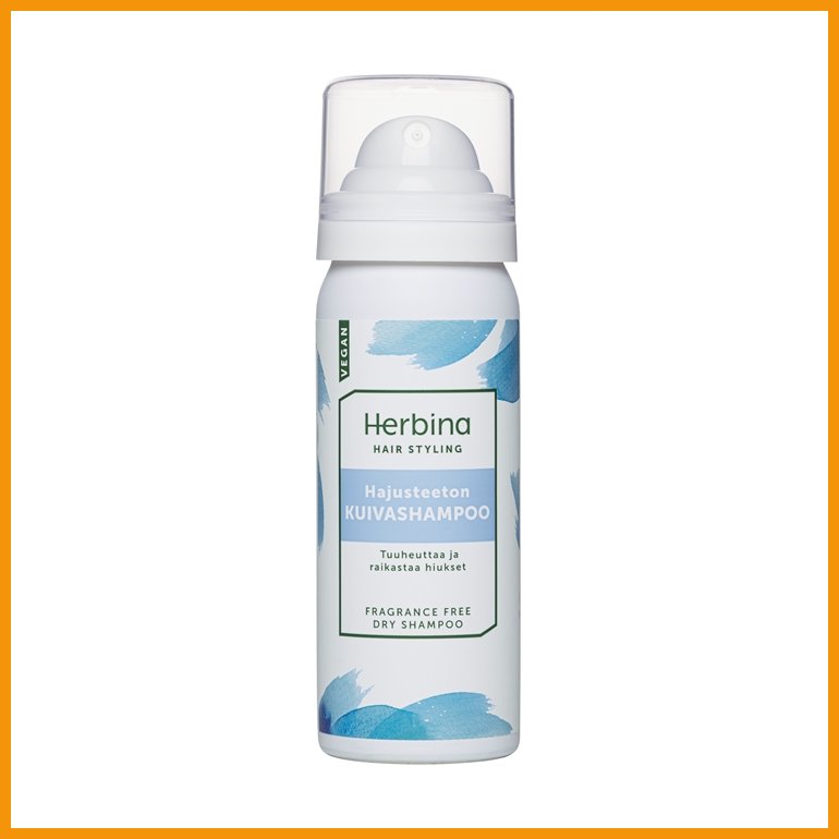 Herbinan hajusteeton kuivashampoo on raikas vaihtoehto hiusten pesuun. Kuivashampoo tuuheuttaa hiuksia ja antaa kampaukselle hyvän pohjan. Tuote poistaa myös tehokkaasti hiuspohjan ja hiusten rasvaisuutta.Pakkauskoko: 50 ml