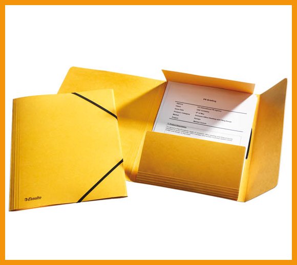 Esselten läpillä varustetussa keltaisessa kulmalukkokansiossa on asiakirjojen putoamisen napakasti estävä kuminauhasuljenta. Laadukas ja vahva kansio on valmistettu FSC-sertifioidusta 390 gsm kartongista.Mitat: 318 x 240 mm