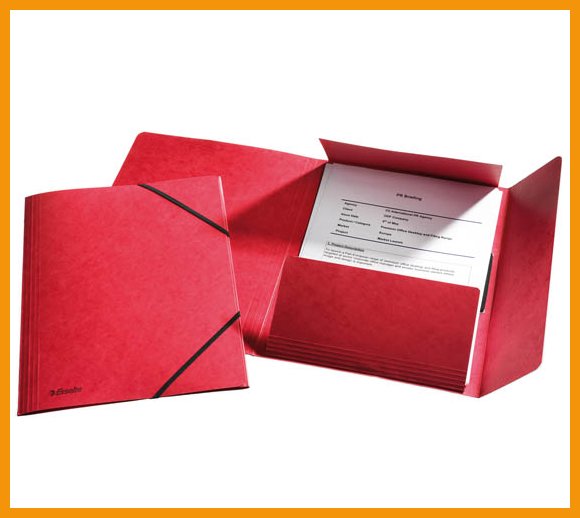 Esselten läpillä varustetussa punaisessa kulmalukkokansiossa on asiakirjojen putoamisen napakasti estävä kuminauhasuljenta. Laadukas ja vahva kansio on valmistettu FSC-sertifioidusta 390 gsm kartongista.Mitat: 318 x 240 mm