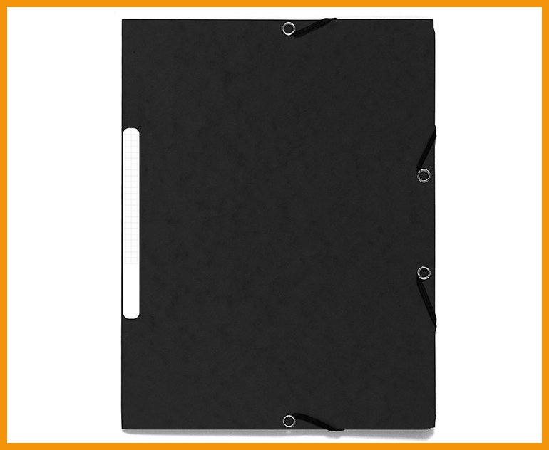 Exacomptan mustassa kulmalukkokansiossa on kolme läppää, kuminauhasuljenta ja tarraetiketti selkämyksessä. Laadukas kansio on valmistettu FSC-sertifioidusta 375 gsm kartongista ja sillä on Blue Angel -ympäristösertifikaatti.Mitat: 320 x 240 mm