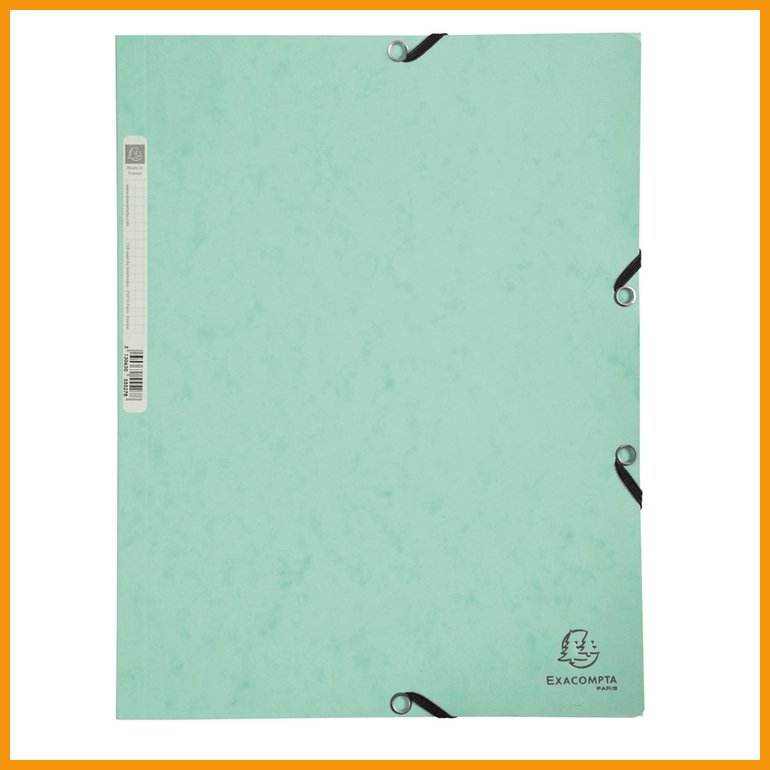 Exacomptan erittäin tukeva kulmalukkokansio kolmella läpällä ja kuminauhasuljennalla. Seläkkeessä on tarraetiketti. Laadukas kansio on valmistettu vankasta, FSC-sertifioidusta 400 gsm kartongista.Mitat: 320 x 240 mm