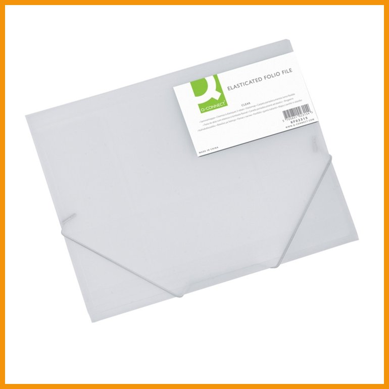 Q-CONNECTin kestävästä, läpikuultavasta polypropeenista valmistetussa kulmalukkokansiossa on kolme läppää ja kuminauhasuljenta.Mitat: 320 x 245 mm