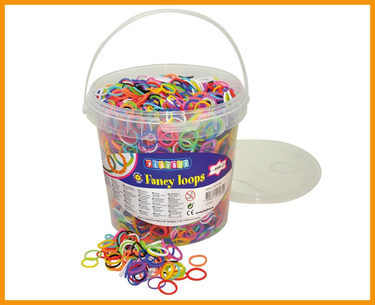 Playboxin värilliset Fancy Loops -kumilenkit soveltuvat hyvin esimerkiksi korujen ja avaimenperien tekoon ja muuhun askarteluun. Lenkit eivät sisällä lateksia.Kantokahvalla varustetussa muoviämpärissä on 5000 kumilenkkiä värilajitelmana.