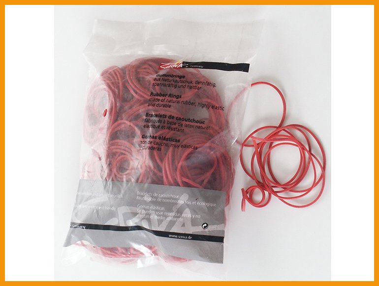 Scrivan luonnonkumista valmistettu kumilenkki muovipussissa.Mitat: halkaisija 57 mm, pituus litteänä 90 mm, leveys 2 mm