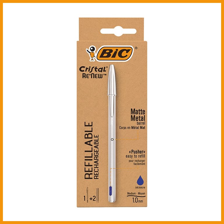 Bic Cristal ReNew on kierrätysmuovista valmistettu versio jo vuosikymmenien ikäisestä klassikosta. 96 % kynässä käytetystä muovista on kierrätettyä ja kaksi vaihtosäiliötä sisältävä pakkaus on valmistettu FSC-sertifioidusta pahvista.Bic Cristal on kaikkine iteraatioineen maailman myydyin kuulakärkikynä. Kestävän kynän runko on mattapintaista metallia ja sen riittoisa muste on arkistokelpoista (ISO 12757-2).