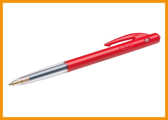 Bic M10 -kuulakärkikynässä on painomekanismi ja vapautusnappi rungon sivussa. Kynässä on osittain musteen värinen, osittain läpinäkyvä runko, jonka läpi näet jäljellä olevan musteen määrän. Muovinen klipsi. Muste on arkistokelpoista (ISO 12757-2).Musteen väri: punainen