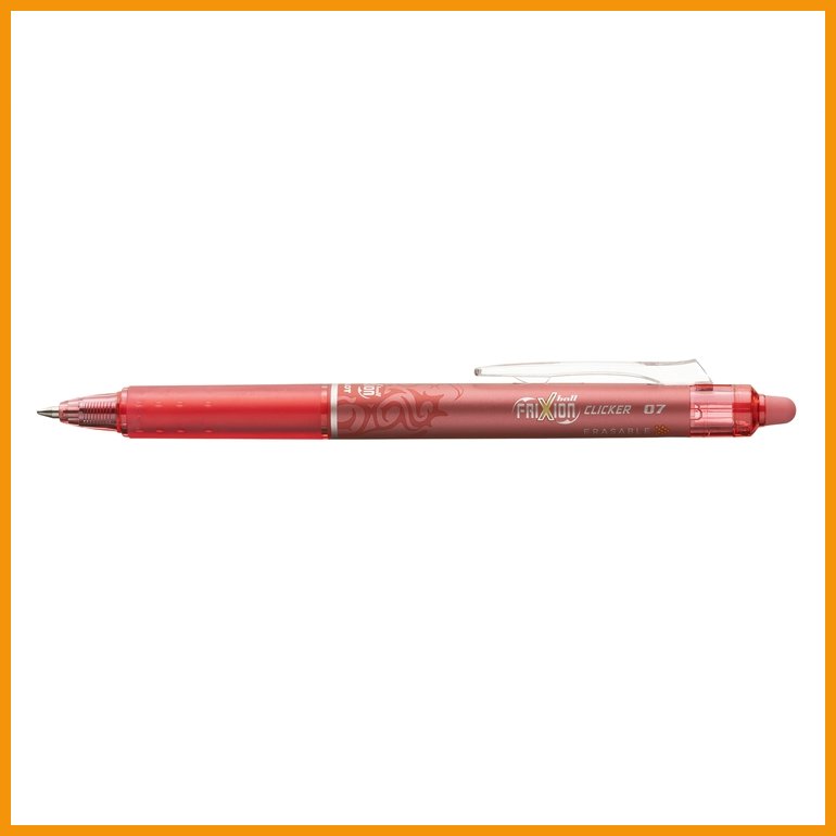 Pilot FriXion Clicker on painomekanismilla varustettu kuulakärkikynä, jonka innovatiivisen ja paperille vaivattomasti liukuvan FriXion-musteen voi pyyhkiä pois kitkan aiheuttaman lämmön avulla, esimerkiksi kynän päässä olevalla pyyhekumilla hankaamalla. Poispyyhkiminen onnistuu jopa vuosien kuluttua kirjoitushetkestä, joten ethän käytä kynää allekirjoituksiin! Musteen värisessä rungossa on pehmeä kumiote ja metallinen taskuklipsi.Kynään on saatavana runsaasti vaihtosäiliöitä kaikissa sateenkaaren väreissä. Etsi verkkokaupasta hakusanalla Vaihtosäiliö Pilot Frixion.