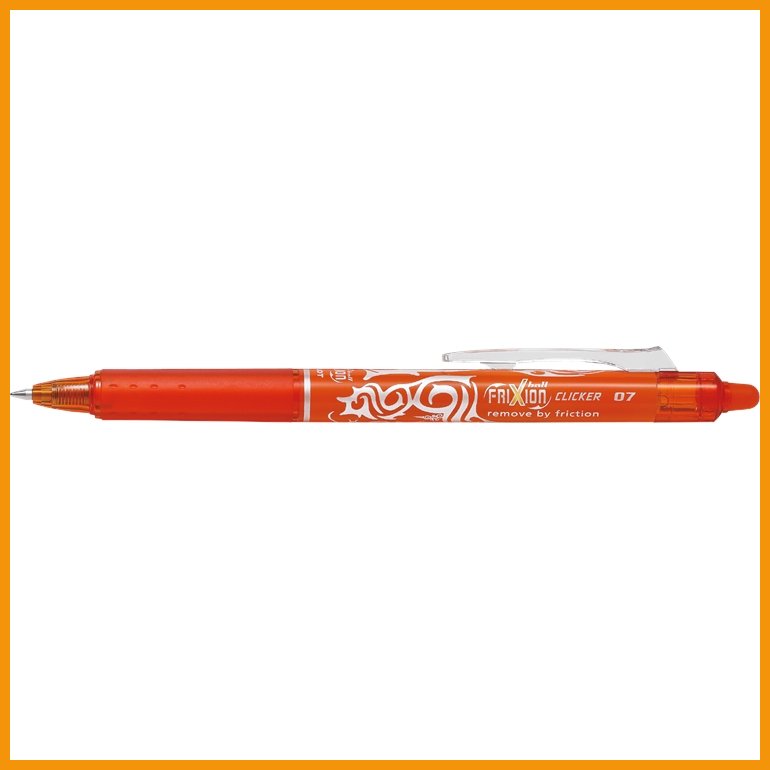 Pilot FriXion Clicker on painomekanismilla varustettu kuulakärkikynä, jonka innovatiivisen ja paperille vaivattomasti liukuvan FriXion-musteen voi pyyhkiä pois kitkan aiheuttaman lämmön avulla, esimerkiksi kynän päässä olevalla pyyhekumilla hankaamalla. Poispyyhkiminen onnistuu jopa vuosien kuluttua kirjoitushetkestä, joten ethän käytä kynää allekirjoituksiin! Musteen värisessä rungossa on pehmeä kumiote ja metallinen taskuklipsi.Kynään on saatavana runsaasti vaihtosäiliöitä kaikissa sateenkaaren väreissä. Etsi verkkokaupasta hakusanalla Vaihtosäiliö Pilot Frixion.