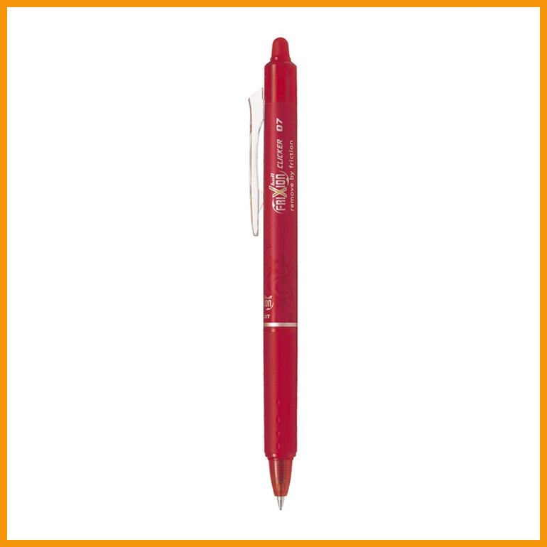 Pilot FriXion Clicker on painomekanismilla varustettu kuulakärkikynä, jonka innovatiivisen ja paperille vaivattomasti liukuvan FriXion-musteen voi pyyhkiä pois kitkan aiheuttaman lämmön avulla, esimerkiksi kynän päässä olevalla pyyhekumilla hankaamalla. Poispyyhkiminen onnistuu jopa vuosien kuluttua kirjoitushetkestä, joten ethän käytä kynää allekirjoituksiin! Musteen värisessä rungossa on pehmeä kumiote ja metallinen taskuklipsi.Kynään on saatavana runsaasti vaihtosäiliöitä kaikissa sateenkaaren väreissä. Etsi verkkokaupasta hakusanalla Vaihtosäiliö Pilot Frixion.