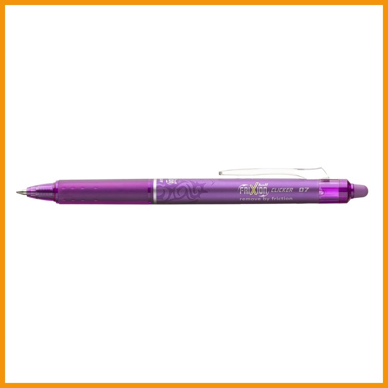 Pilot FriXion Clicker on painomekanismilla varustettu kuulakärkikynä, jonka innovatiivisen ja paperille vaivattomasti liukuvan FriXion-musteen voi pyyhkiä pois kitkan aiheuttaman lämmön avulla, esimerkiksi kynän päässä olevalla pyyhekumilla hankaamalla. Poispyyhkiminen onnistuu jopa vuosien kuluttua kirjoitushetkestä, joten ethän käytä kynää allekirjoituksiin! Musteen värisessä rungossa on pehmeä kumiote ja metallinen taskuklipsi.Kynään on saatavana runsaasti vaihtosäiliöitä kaikissa sateenkaaren väreissä. Etsi verkkokaupasta hakusanalla Vaihtosäiliö Pilot Frixion.