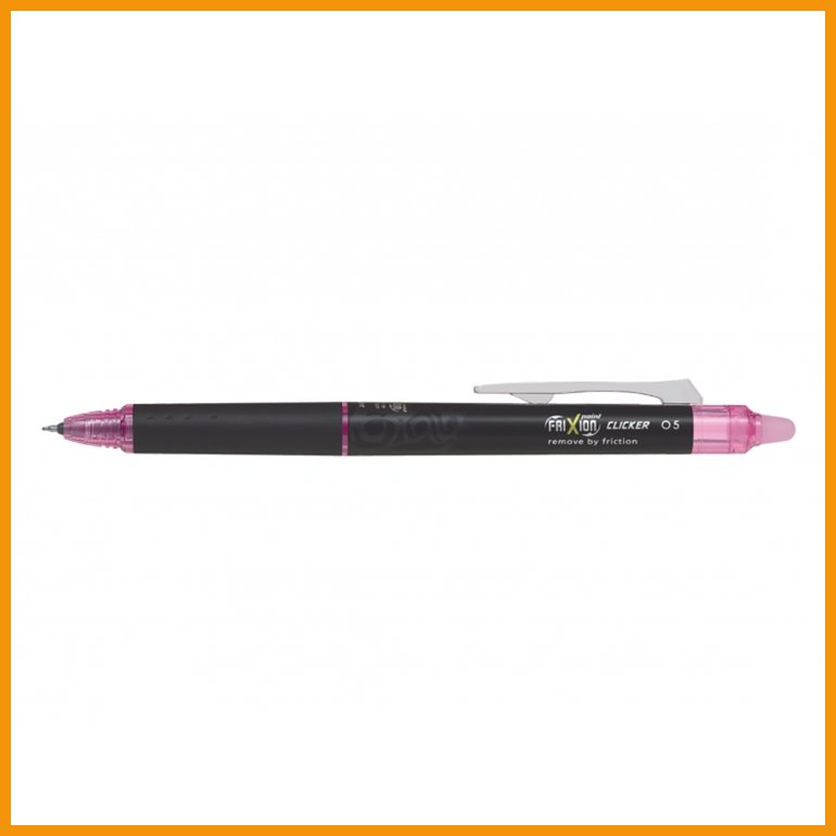 Pilot FriXion Point Clicker on painomekanismilla varustettu kuulakärkikynä, jonka innovatiivisen ja paperille vaivattomasti liukuvan FriXion-musteen voi pyyhkiä pois kitkan aiheuttaman lämmön avulla, esimerkiksi kynän päässä olevalla pyyhekumilla hankaamalla. Poispyyhkiminen onnistuu jopa vuosien kuluttua kirjoitushetkestä, joten ethän käytä kynää allekirjoituksiin! Rungossa on pehmeä kumiote, musteen väriset yksityiskohdat ja metallinen taskuklipsi.Kynään on saatavana runsaasti vaihtosäiliöitä kaikissa sateenkaaren väreissä. Etsi verkkokaupasta hakusanalla Vaihtosäiliö Pilot Frixion.