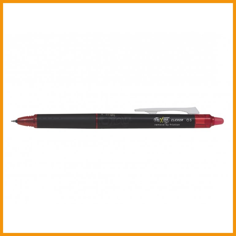Pilot FriXion Point Clicker on painomekanismilla varustettu kuulakärkikynä, jonka innovatiivisen ja paperille vaivattomasti liukuvan FriXion-musteen voi pyyhkiä pois kitkan aiheuttaman lämmön avulla, esimerkiksi kynän päässä olevalla pyyhekumilla hankaamalla. Poispyyhkiminen onnistuu jopa vuosien kuluttua kirjoitushetkestä, joten ethän käytä kynää allekirjoituksiin! Rungossa on pehmeä kumiote, musteen väriset yksityiskohdat ja metallinen taskuklipsi.Kynään on saatavana runsaasti vaihtosäiliöitä kaikissa sateenkaaren väreissä. Etsi verkkokaupasta hakusanalla Vaihtosäiliö Pilot Frixion.