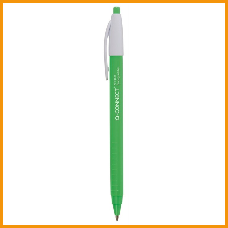 Q-Connect Biodegradable -kuulakärkikynän runko on valmistettu maissitärkkelyksestä. Kynässä on painomekanismi ja taskuklipsi.Musteen väri: sininen