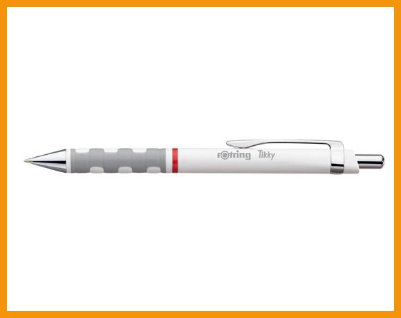 Kevyessä Rotring Tikky -kuulakärkikynässä on ergonominen kumilla pinnoitettu kolmikulmainen runko, painomekanismi ja metallinen taskupidike. Jumbosäiliö pitää sisällään runsaasti arkistokelpoista mustetta (ISO 12557-2).Musteen väri: sininen