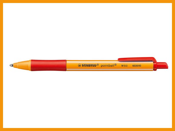Stabilo Pointball on painomekanismilla varustettu kuulakärkikynä. Jopa 79-prosenttisesti kierrätysmuovista valmistettuun kynään on saatavilla myös vaihtosäiliö. Kynän rungossa on pehmustettu otepinta helpottamaan kirjoittamista.Musteen väri: punainen