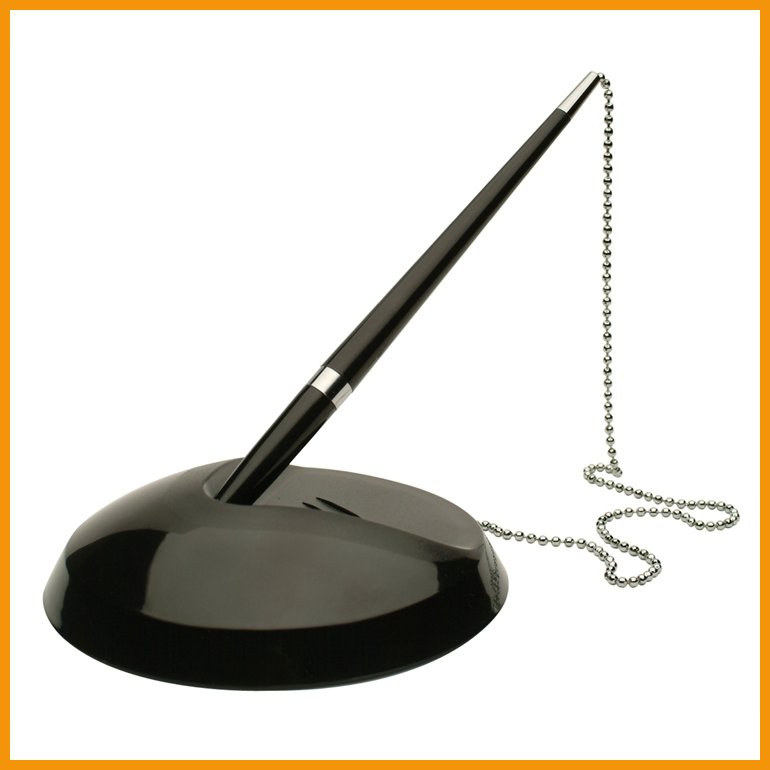 Q-Connectin erityisesti hotellien ja muiden palveluiden vastaanottopöydille suunnitellussa kuulakärkikynässä on 55 cm pituinen ketju, joka pitää sen aina lähellä telinettään. Sekä painotettu teline että kynä ovat tyylikkään mustat.Musteen väri: sininen