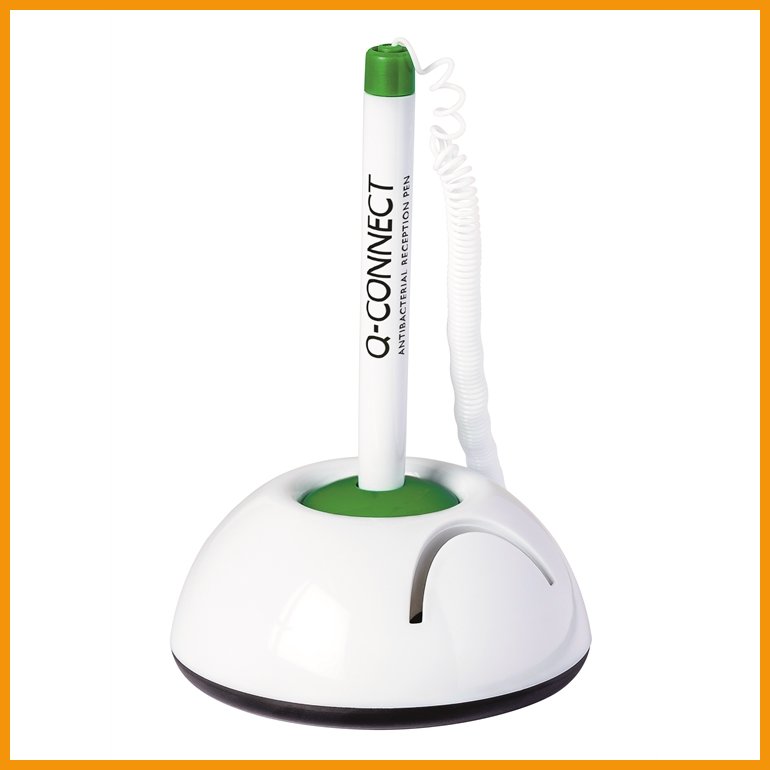 Q-Connectin antibakteerinen vastaanottokynä soveltuu erityisesti terveydenhuollon vastaanottopöydille. Kuulakärkikynässä on 100 cm pituinen muoviketju, joka pitää sen aina lähellä telinettään. Sekä teline että kynä on käsitely niin, etteivät taudinaiheuttajat elä niiden pinnalla. Telineessä on paikka papereille ja pohjassa liimapinta, jolla voit kiinnitää sen paikalleen pöydän pintaan.Musteen väri: sininen.