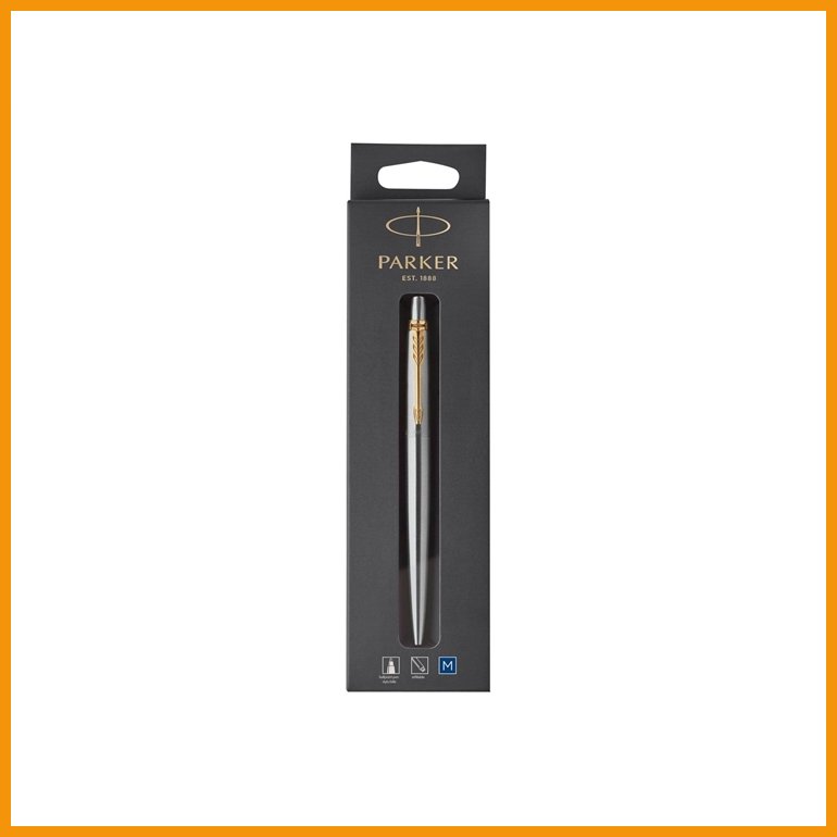 Kuulakynä Parker Jotter teräs kultaisilla koristeilla on loistava kirjoitusväline, jonka toimituksen kesto on verkkokaupasta tilattuna 1-2 päivää. Huomaa, että toimitus on ilmainen yli 140 € hintaisille verkkokauppa ostoksille! Meiltä voit tilata laskulla ja ilman rekisteröitymistä.
