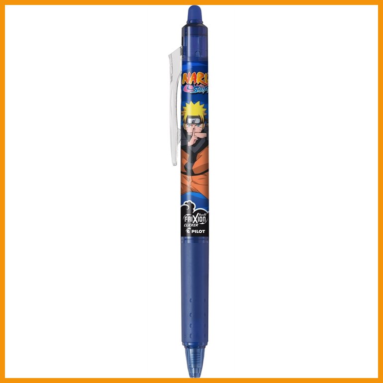 Pilot FriXion Clicker Naruto on painomekanismilla varustettu kuulakärkikynä, jonka innovatiivisen ja kirjoitusalustalla hyvin liukuvan FriXion-geelimusteen voi pyyhkiä pois kitkan aiheuttaman lämmön avulla, esimerkiksi kynän päässä olevalla pyyhekumilla hankaamalla. Poispyyhkiminen onnistuu jopa vuosien kuluttua kirjoitushetkestä, joten ethän käytä kynää allekirjoituksiin! Musteen värisessä rungossa on pehmeä kumiote ja metallinen taskuklipsi.Kynään on saatavana runsaasti vaihtosäiliöitä kaikissa sateenkaaren väreissä. Etsi verkkokaupasta hakusanalla Vaihtosäiliö Pilot Frixion.