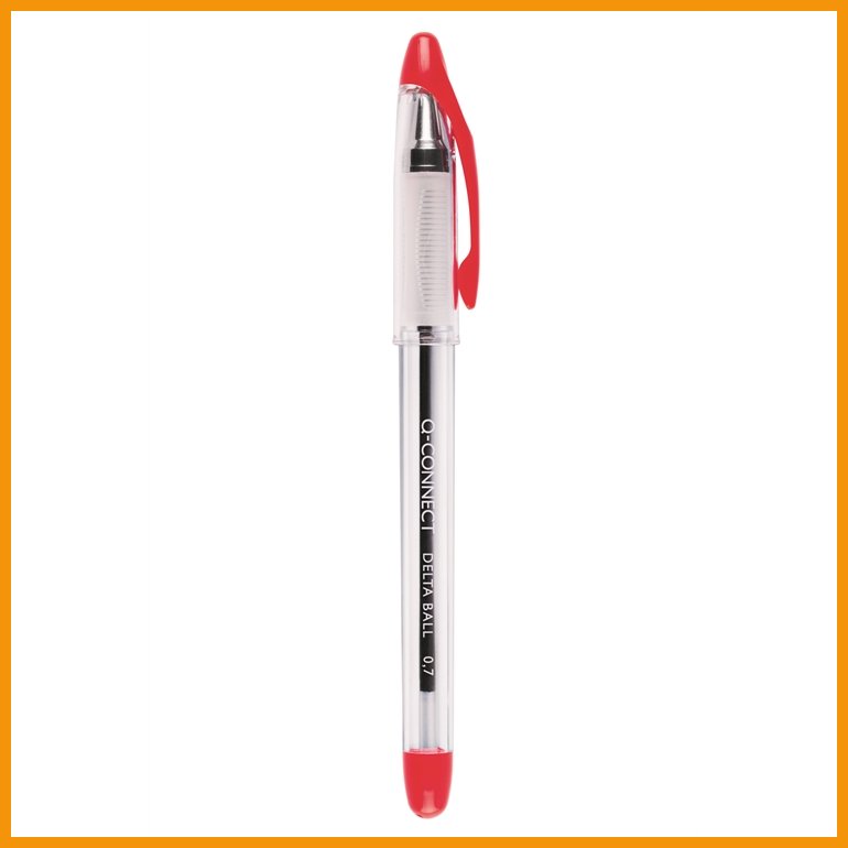 Uudelleentäytettävässä ja osittain kierrätysmateriaalista valmistetussa Q-CONNECT Delta -kuulakärkikynässä on läpinäkyvä muovirunko, kirjoittamista helpottava kuminen otealue ja metallikärki. Korkissa on muovinen klipsi.Musteen väri: punainen