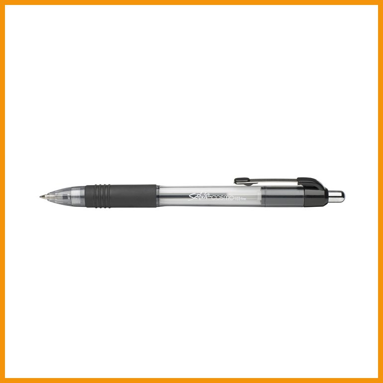 Painomekanismilla varustetussa Scriva COSMO -kuulakärkikynässä on läpinäkyvä muovirunko, kirjoitusmukavuutta lisäävä kumimainen otepinta ja metallinen taskupidike. Öjypohjainen muste on arkistokelpoista (ISO 12757-2) ja sillä on kevyt kirjoittaa. Muste virtaa tasaisesti kynästä ja kirjoitusjälki on siisti ja tasainen. Riittoisa muste kuivuu nopeasti kirjoitusalustaansa eikä suttaa. Kynässä on vaihdettava säiliö.Musteen väri: musta
