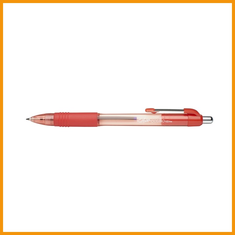Painomekanismilla varustetussa Scriva COSMO -kuulakärkikynässä on läpinäkyvä muovirunko, kirjoitusmukavuutta lisäävä kumimainen otepinta ja metallinen taskupidike. Öjypohjainen muste on arkistokelpoista (ISO 12757-2) ja sillä on kevyt kirjoittaa. Muste virtaa tasaisesti kynästä ja kirjoitusjälki on siisti ja tasainen. Riittoisa muste kuivuu nopeasti kirjoitusalustaansa eikä suttaa. Kynässä on vaihdettava säiliö.Musteen väri: punainen