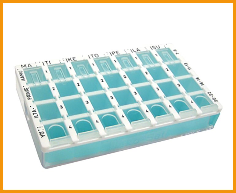 Suomenkielisessä Medi Jakoset -lääkejakeludosetissa on neljä lokeroa viikon jokaiselle päivälle. Nimetyt lokerot sekä kellonajat että aamu/päivä/ilta/yö-merkinnät.Koko: medium (153 x 92 x 24 mm)
