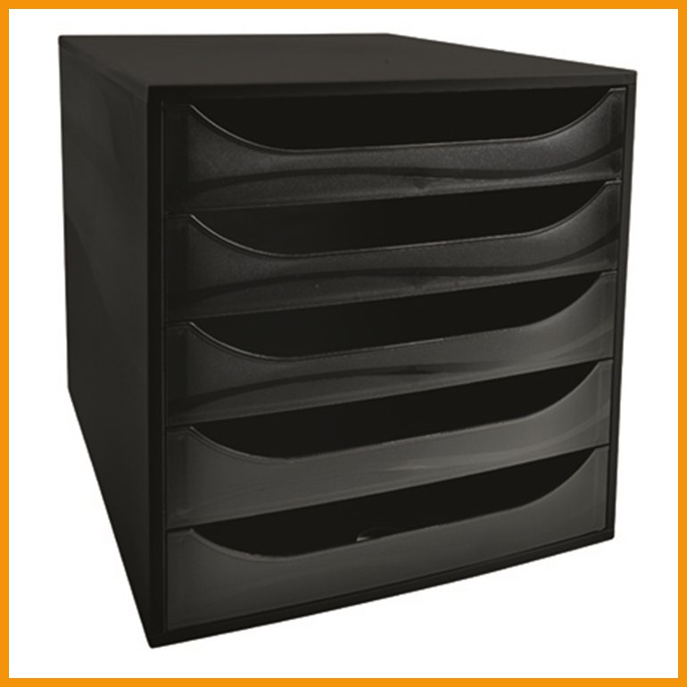 Exacompta Ecobox -vetolaatikostossa on 5 lokeroa A4+ -kokoisille papereille. Avonaisissa vetolaatikoissa on stopparit, ja sisältöön pääsee käsiksi laatikoita avaamatta. Sekä runko että vetolaatikot ovat mustat.Tuotteella on Blue Angel -ympäristösertifikaatti.