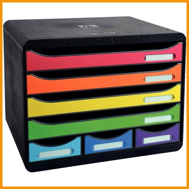 Kaikissa sateenkaaren väreissä komeilevassa Exacompta Store-Box -vetolaatikostossa on 4 lokeroa A4+ -kokoisille papereille ja 3 kapeampaa laatikkoa pientarvikkeille. Avonaisissa vetolaatikoissa on stopparit ja etiketinpitimet. Sisältöön pääsee käsiksi laatikoita avaamatta.Tuotteella on Blue Angel -ympäristösertifikaatti.