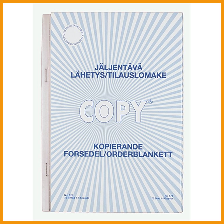 Plastipapin jäljentävästä paperista valmistettu Lähetys/tilauslomake 575 on viivoitettu ja perforoitu.