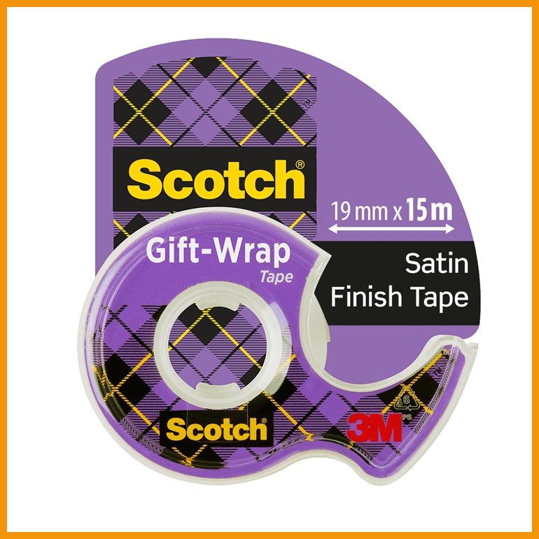 Scotch Gift-Wrap -lahjateipissä on ainutlaatuinen satiininen pinta, joka häviää näkyvistä yleisimmässä lahjapapereissa. Teipin vahva ja pysyvä liima pitää lahjapaketit varmasti kasassa. Pakkauksessa on myös teippiteline.