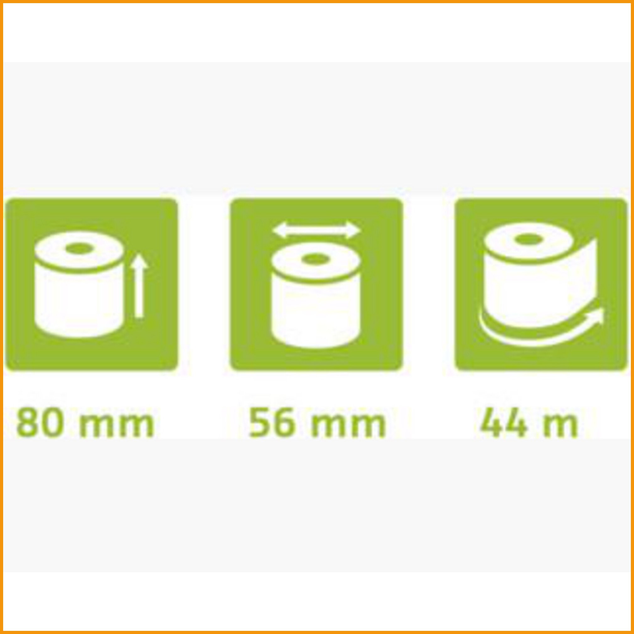 | Lämpöpaperirullan mitat | Hylsy Ø: 12 mm Leveys: 80 mm Pituus: 44 m Rulla max. Ø: 60 mm |