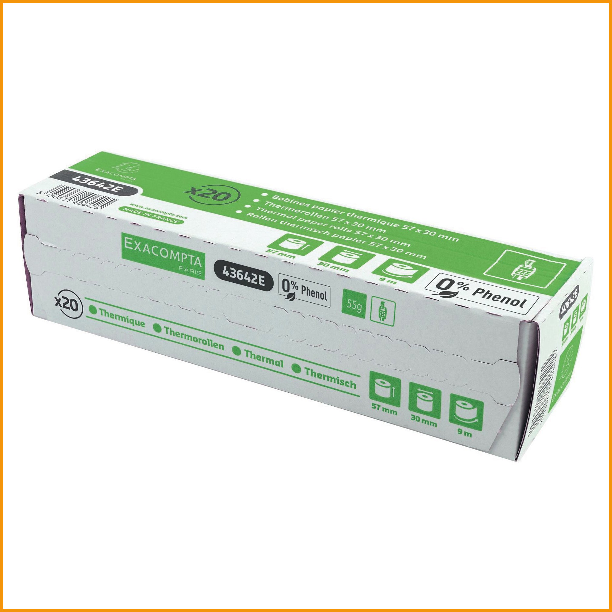 Exacompta lämpöpaperirullat on valmistettu hieman siniharmaasta paperista, johon ei vaikuta lämpö, valo tai kosteus, mikä takaa pitkäkestoisen jäljen (vähintään 35 vuotta) valmistettu ilman kemiallisia kehitteitä, bpa- ja fenoliton. lämpöpaperirullat ovat turvallisia terveydelle ja ne on jopa hyväksytty suoraan kosketukseen elintarvikkeiden kanssa. ympäristöystävällinen paperi, joka on fsc-sertifioitu ja voidaan kierrättää jätepaperin kanssa.Lämpöpaperirullat toimitetaan 20 kappaleen erissä.