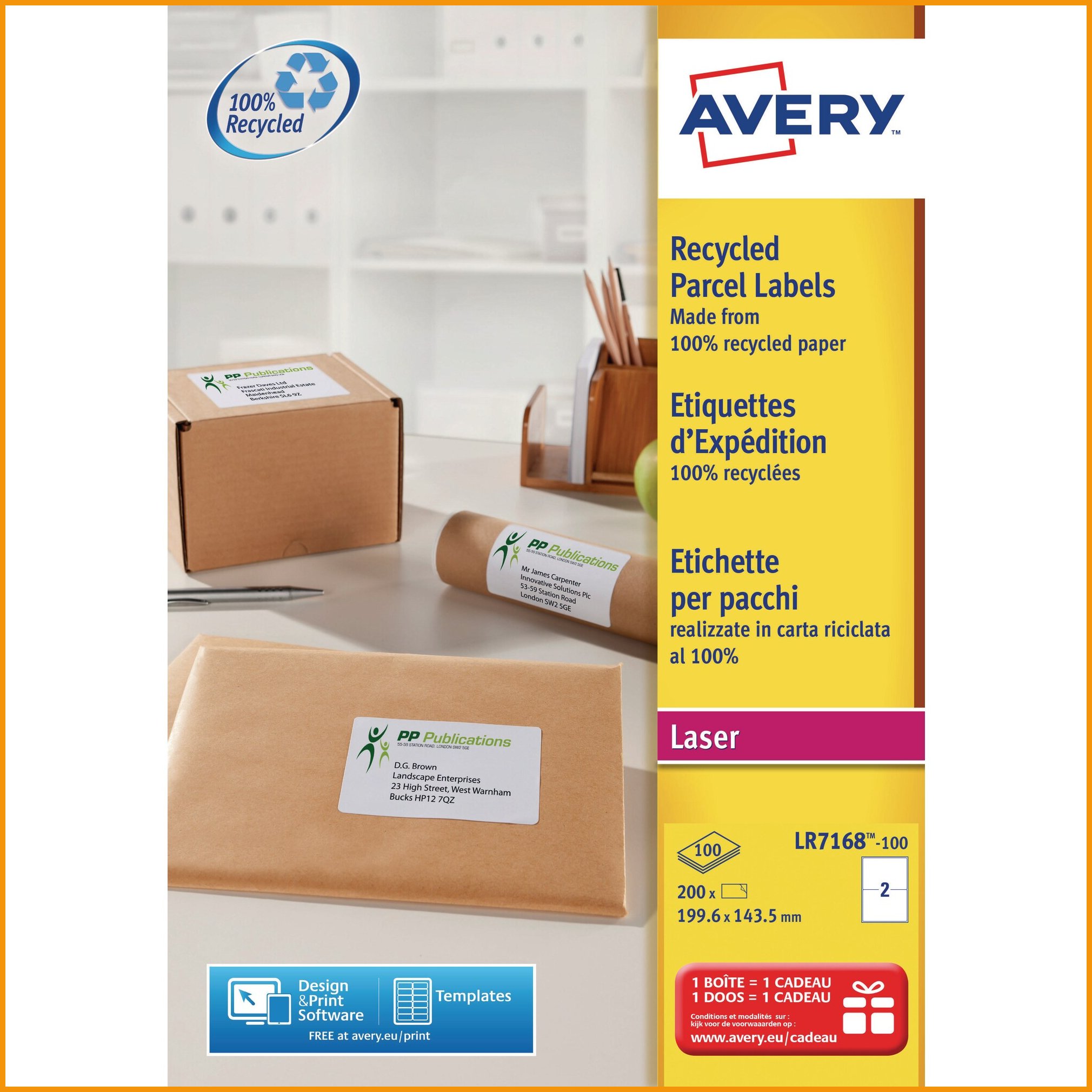 Onnittelut, täydellinen ratkaisu suuriin merkintätarpeisiin! Avery LR7168 kierrätettävä lasertarra toimii sekä lasertulostimissa että mustesuihkutulostimissa, ja sen pysyvä liimapinta takaa varman tartunnan paperille, pahville, muoville ja lasille. Tarran koko on 199,6 x 143,5 mm – eli kaksi suurta etikettiä per A4-arkki – mikä tekee siitä erinomaisen valinnan pakettitarroiksi, suurikokoisiksi osoitetarroiksi, tuote-etiketeiksi ja asiakirjojen merkintään. Valkoinen kierrätyspaperista valmistettu lasertarra tarjoaa ammattimaisen ulkoasun ja terävän tulostusjäljen, ja se irtoaa taustapaperista helposti ilman tulostimen tukkeutumisen riskiä. Pakkauksessa on 100 A4-arkkia, joissa kussakin 2 etikettiä – yhteensä 200 korkealaatuista tarraa. Avery LR7168 lasertarrat yhdistävät ekologisuuden, helppokäyttöisyyden ja tehokkuuden toimiston arkeen.Lasertarrat toimitetaan 200 kappaleen erissä.