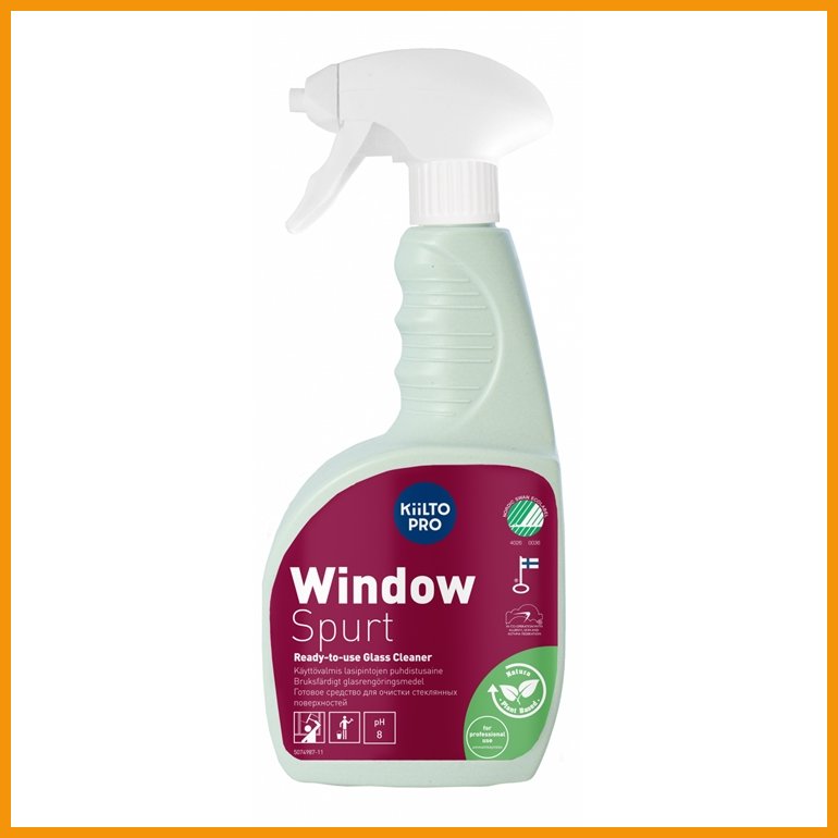 Kiilto Pro Window Spurt on käyttövalmis puhdistusaine lasi-, peili- ja metallipinnoille. Tehokkaasti rasvan, tahrat, lian ja noen pinnoilta poistava aine kuivuu nopeasti eikä jätä ikkunoille kalvoa. Tuotetta voidaan käyttää myös pakkasella jopa -20 °C lämpötilassa, joten voit pitää ikkunat puhtaina ympäri vuoden.Kotimaisella Kiilto Pro Natura -sarjan tuotteella on Avainlippu-tunnus ja pohjoismainen Joutsenmerkki. Hellävaraisella tuotteella on myös Allergia-, Iho- ja Astmaliiton tunnus.