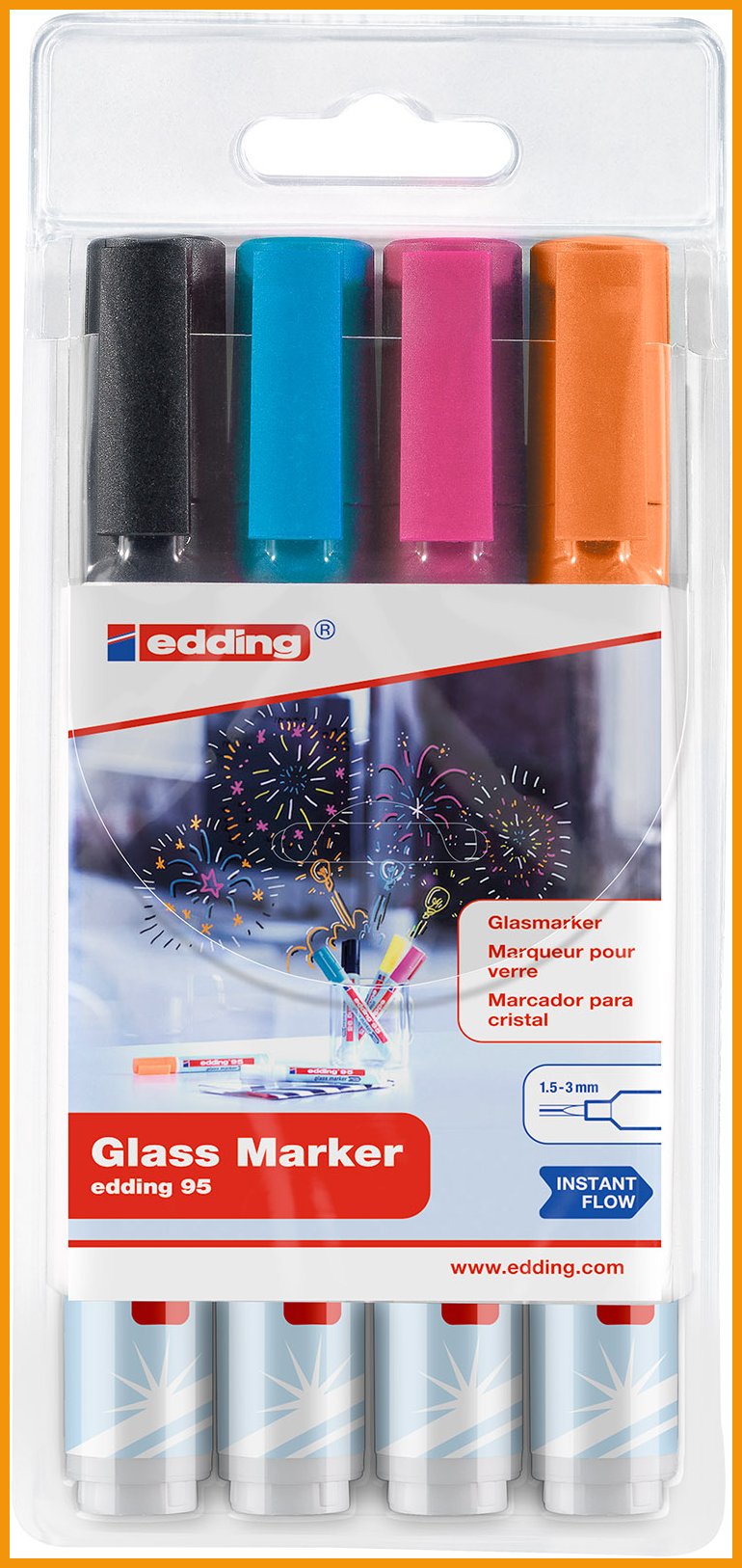 Edding 95 on erityisesti lasitauluille suunniteltu kynä, joka toimii myös valkotauluilla. Kynän jälki on helppo pyyhkiä pois esimerkiksi kuivalla kankaalla.Hajuton muste on valonkestävää.