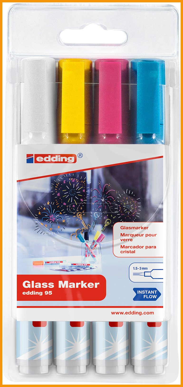 Edding 95 on erityisesti lasitauluille suunniteltu kynä, joka toimii myös valkotauluilla. Kynän jälki on helppo pyyhkiä pois esimerkiksi kuivalla kankaalla.Hajuton muste on valonkestävää.
