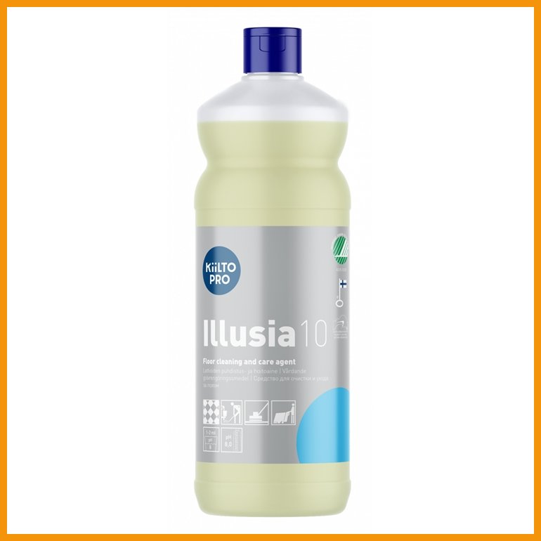 Kiilto Pro Illusia 10 on tensidipohjainen ja kerrostumaton puhdistus- ja hoitoaine kovien lattioiden jaksottaiseen ylläpitosiivoukseen ja hoitoon. Sekä käsi- että konemenetelmiin sopiva aine korjaa säännöllisesti käytettynä kulumia ja helpottaa ylläpitosiivousta. Tuotteen puhdistusteho on korkea.