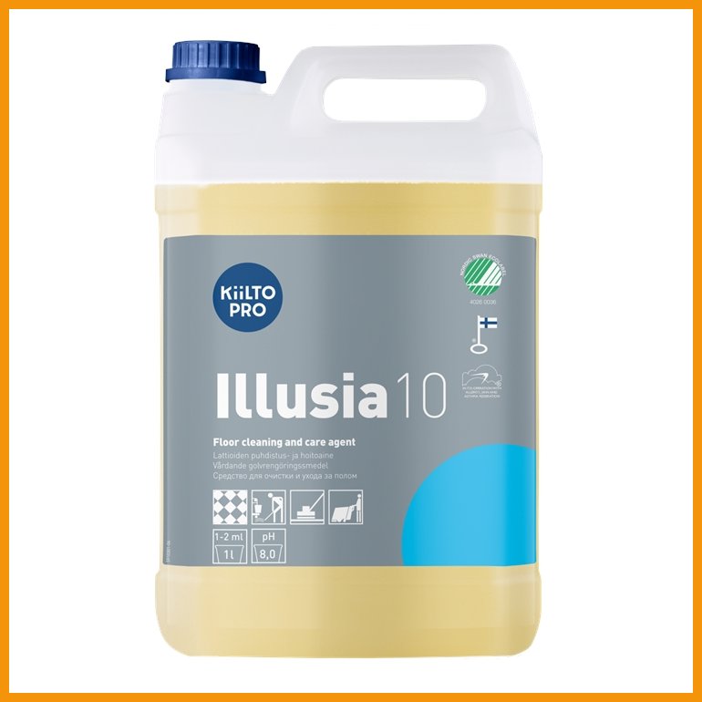 Kiilto Pro Illusia 10 on tensidipohjainen ja kerrostumaton puhdistus- ja hoitoaine kovien lattioiden jaksottaiseen ylläpitosiivoukseen ja hoitoon. Sekä käsi- että konemenetelmiin sopiva aine korjaa säännöllisesti käytettynä kulumia ja helpottaa ylläpitosiivousta. Tuotteen puhdistusteho on korkea.