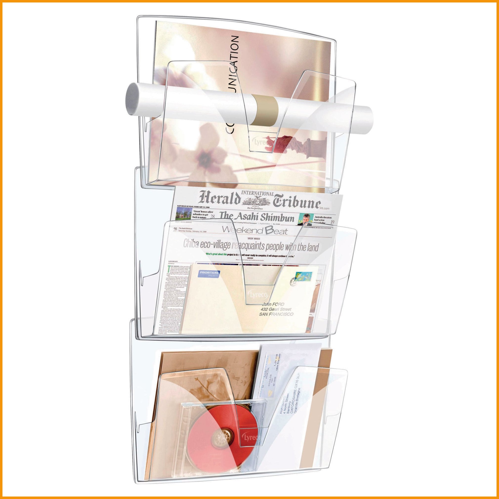 Aseta lehdet, kuvastot ja esitteet esille 3-osaiseen lyreco-seinätelineeseen. telineeseen mahtuu enintään 24 x 32 cm dokumentteja. mukana tulee asennuspakkaus. seinäteline on 100-prosenttisesti kierrätettävää polystyreeniä. Lehtitelineen mitat ovat: 36,1 x 8,6 x 27 cm.Lehtiteline Lyreco seinämalli 3-osainen kirkas on laadukas toimistotarvike, jonka verkkokaupan tilauksen toimitus kestää 1-2 päivää. Tiedäthän, että hinnaltaan yli 140 € verkkokauppatilaus toimitetaan aina ilmaiseksi! Meiltä voit tilata laskulla ja ilman rekisteröitymistä.