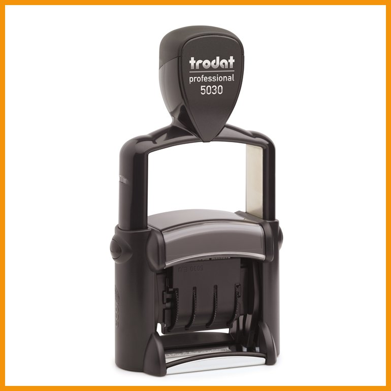 Trodat Professional 5030 on itsevärjäytyvä, jalustamallinen päiväysleimasin 4 mm fonttikoolla ja mustalla värityynyllä. Harjatusta ruostumattomasta teräksestä valmistettu kiinteä metallirunko tekee leimasimesta jämäkän työjuhdan.Päivämäärän/luvun muoto: PP.KK.VVVV.