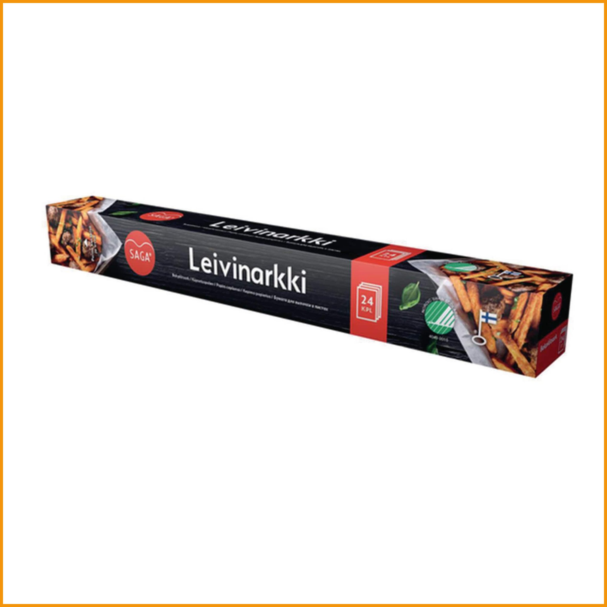 Saga-leivinarkki on rasvatiivis, erittäin lämmönsietokykyinen ja molemmin puolin silikonoitu. Sen avulla on helppo leipoa tahmeatkin taikinat. Sertifioidusta puusta valmistettu leivinpaperiarkki on lisäksi biohajoava ja kompostoituva. Leivinpaperiarkin mitat ovat: 38 x 42 cm.Leivinpaperiarkit toimitetaan 24 kappaleen erissä.