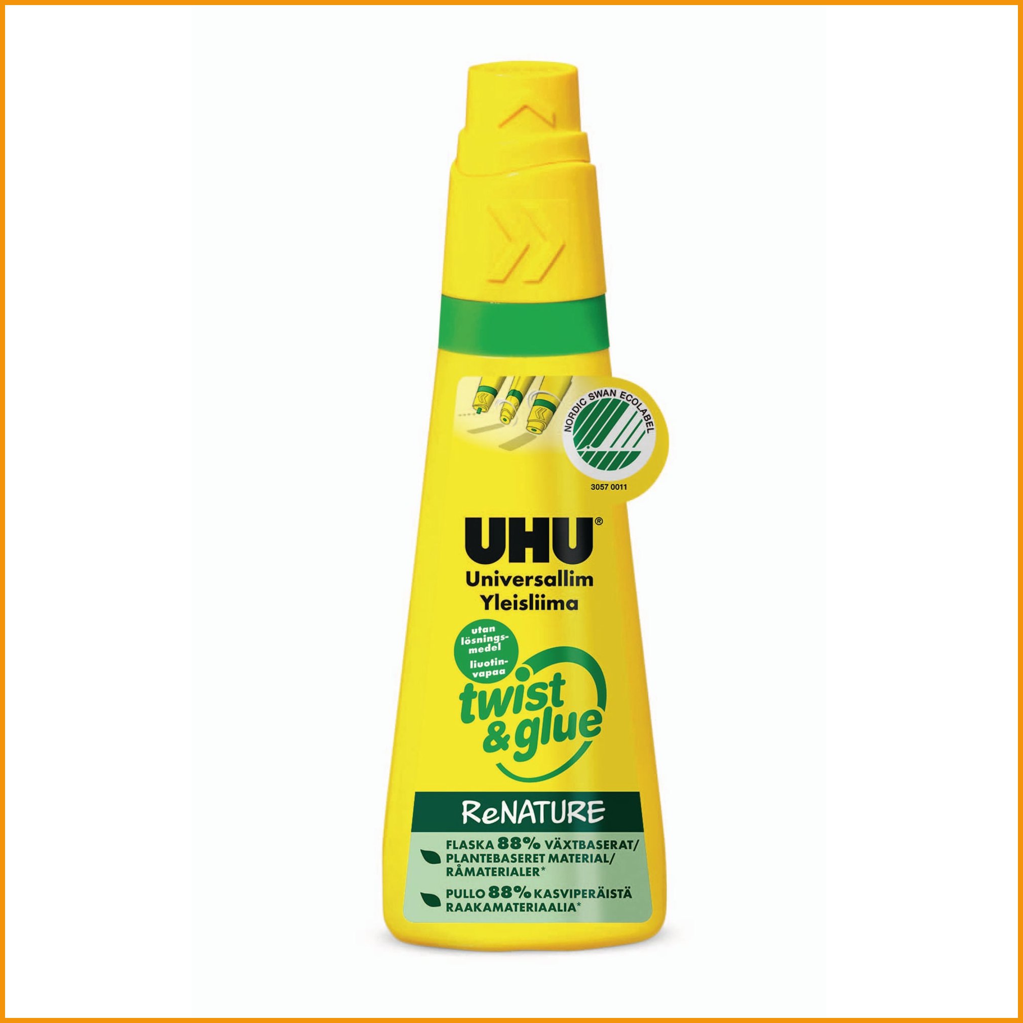 Liimakynä Uhu twist & glue renature 95ml/100g on vesiliukoinen geelimäinen yleisliima, joka liimaa lähes kaikkia materiaaleja. Liimakynän liima on helposti levitettävä ja liimajäljen leveys säädettävissä kapeaksi tai leveäksi.
