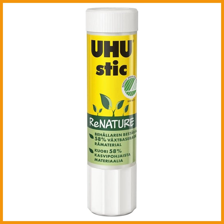 UHU Stic ReNature on paperin, valokuvien ja ohuen pahvin liimaamiseen tarkoitettu liimapuikko. Ilmatiivis korkki estää liimaa kuivumasta ennen aikojaan. Liiman voi pestä pois kylmällä vedellä.Vesipohjainen ja vahvasti kiinnittävä liima on valmistettu 98-prosenttisesti luonnollisista ainesosista eikä se sisällä liuottimia tai PVC:tä. Myös muovirunko on valmistettu 58-prosenttisesti kasvipohjaisista raaka-aineista.