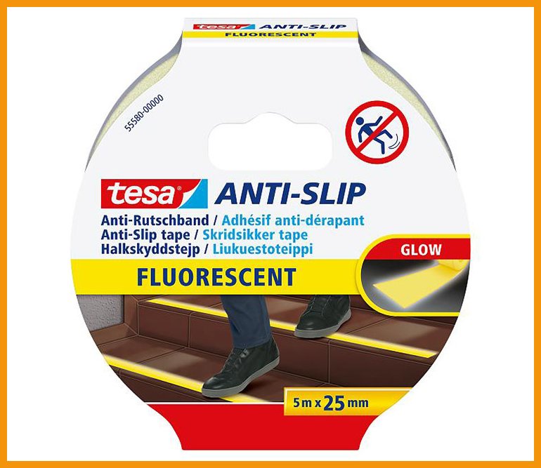 Jälkivalaiseva tesa Anti-Slip -liukuesteteippi ehkäisee tehokkaasti liukastumisia ja kompastumisia vaarallisissa paikoissa, kuten portaissa, rampeissa, veneiden kansilla ja liukkailla lattioilla. Teippi hohtaa pimeässä jopa 20 minuuttia valojen sammuttamisen jälkeen.Kovaakin käyttöä kestävä teippi kiinnittyy voimakkaasti tasaisille ja puhtaille pinnoille. Sekä sisä- että ulkokäyttöön soveltuva teippi kestää niin UV-valoa, vettä, äärimmäisiä lämpötiloja kuin puhdistusaineitakin. Rullasta voi katkaista käsin sopivan palan.