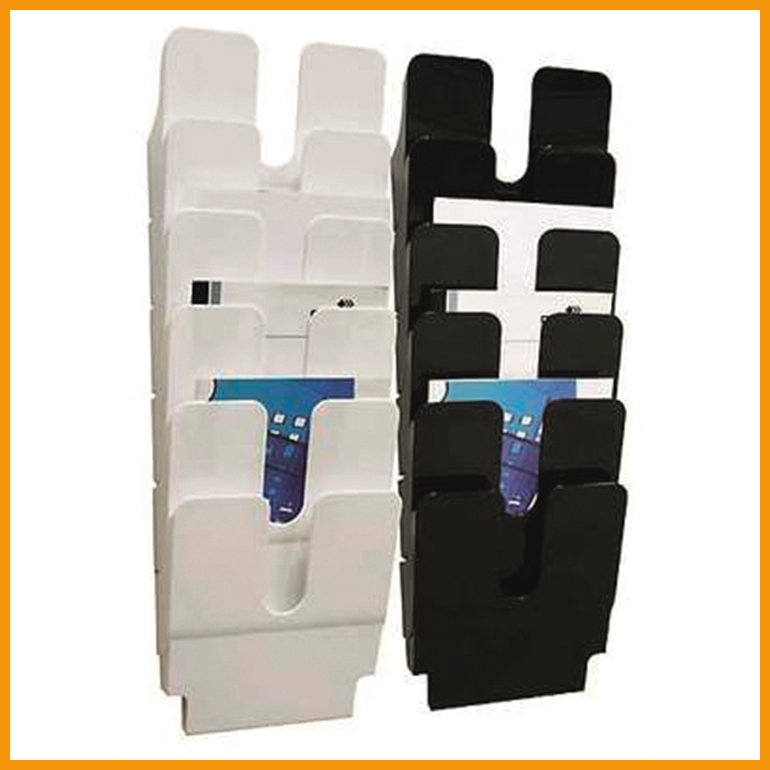 Durable Flexiplus -sarjan seinään kiinnitettävä esiteteline 6 pystysuuntaisella lokerolla A4-kokoisille esitteille. Tuote koostuu kuudesta toisiinsa kiinnitettävästä osasta, joista voi koota tarvittaessa isommankin kokonaisuuden. Käyttöä helpottavilla lovilla varustettu teline on valmistettu kestävästä polystyreenimuovista. Kiinnikkeet sisältyvät toimitukseen.Mitat: 1080 x 247 x 100 mm