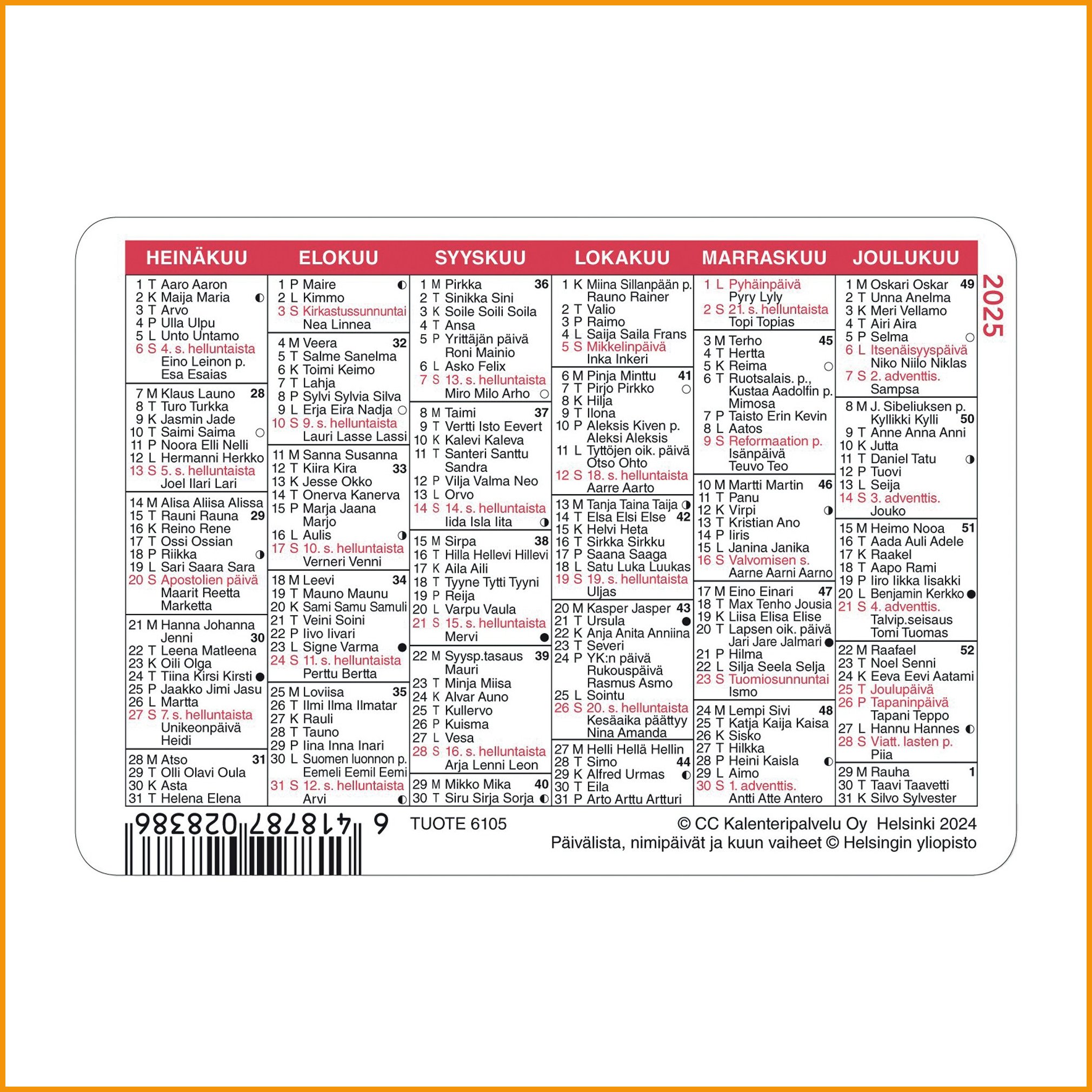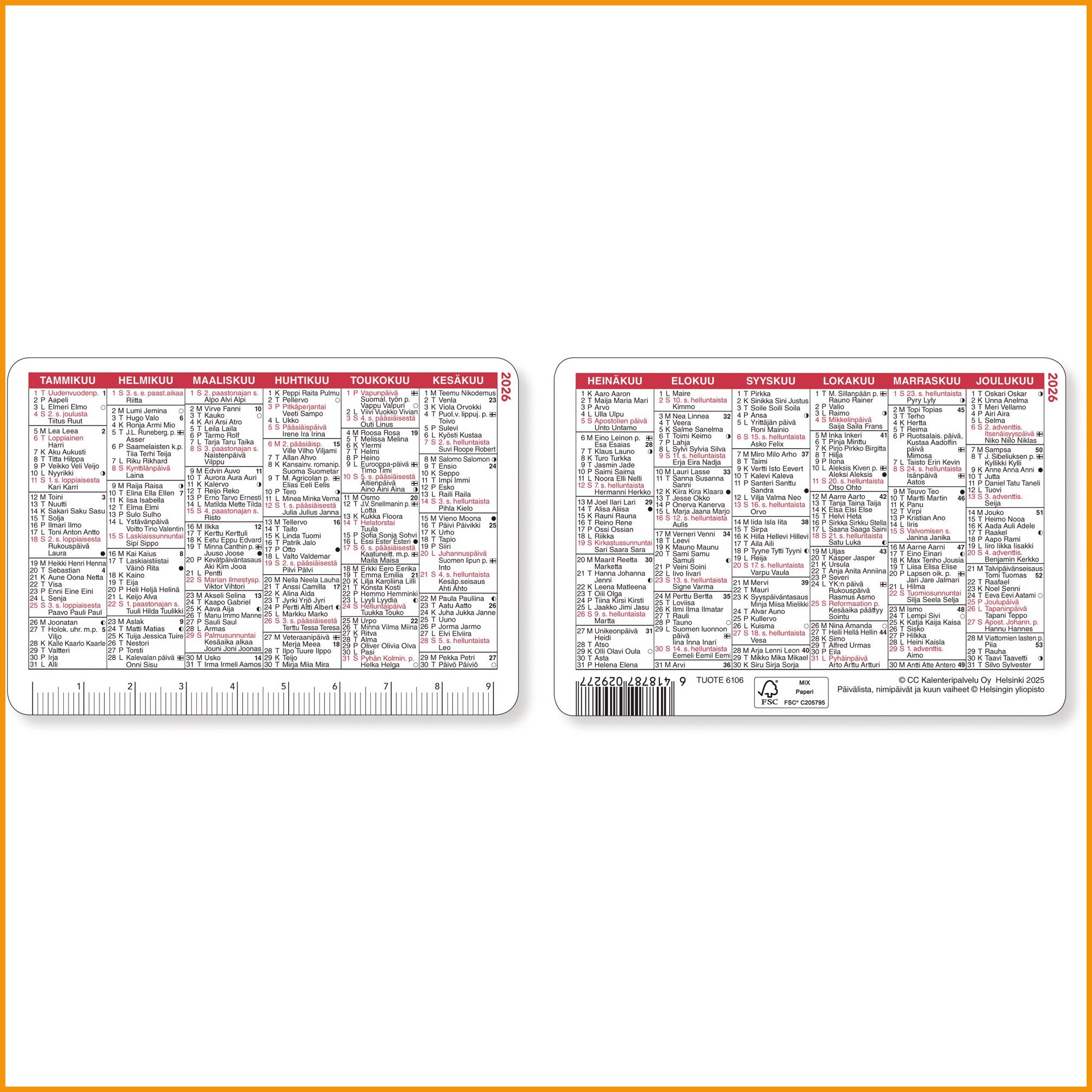 CC 6106 Lompakkoalmanakka 2026 CC 6106 Lompakkoalmanakka 2026 on pieni ja käytännöllinen taskukalenteri, joka kulkee mukanasi minne tahansa. Kompaktin kokonsa (100 x 70 mm) ansiosta se mahtuu helposti lompakkoon tai taskuun, joten ajantasainen kalenteri on aina käden ulottuvilla. Tämä vuoden 2026 taskukalenteri on suunniteltu kestämään päivittäistä käyttöä – laminoitu pinta suojaa sitä kulumiselta ja pyöristetyt kulmat tekevät käsittelystä miellyttävää. Lompakkoalmanakka näyttää kerralla kuusi kuukautta per puoli, mikä tekee siitä tehokkaan apuvälineen niin työssä kuin arjessa. Mukana on liputuspäivät, kansalliset pyhät, nimipäivät ja kuun vaiheet, joten pysyt aina ajan tasalla tärkeistä päivistä. Yhdelle reunalle sijoitettu mittaviivoitus tuo lisäkäytännöllisyyttä, sillä kalenteri toimii myös nopeana mittatyökaluna. Kieliversiona on suomi, ja selkeä ulkoasu takaa helppolukuisuuden. Tämä taskukalenteri 2026 on täydellinen valinta, jos etsit pientä, kestävää ja helppoa kalenteria, joka kulkee aina mukana. Tilaa kalenteri netistä ja varmista, että vuosi 2026 pysyy järjestyksessä missä ikinä oletkin.Kalentereilla ei ole vaihto- eikä palautusoikeutta.Lompakkoalmanakka 2026 Cc 6106 100 x 70mm on korkeatasoinen kalenteritarvike, jonka toimituksen kesto on verkkokaupasta tilattuna 1-2 päivää. Huomaa, että hinnaltaan yli 140 € verkkokauppatilaus toimitetaan aina ilmaiseksi! Meiltä voit tilata laskulla ja ilman rekisteröitymistä.