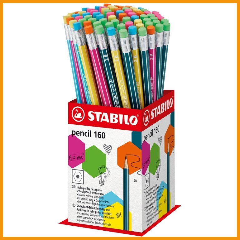 Värilajitelma kumilla varustettuja STABILO 160 -lyijykyniä kynäpurkissa. Kynässä on perinteinen kuusikulmainen runko ja erittäin kestävä lyijy. Se soveltuu yhtä lailla niin kirjoittamiseen, piirtämiseen kuin luonnosteluunkin.Kaikki STABILOn puiset kynät valmistetaan FSC- tai PEFC-sertifioidusta materiaalista.