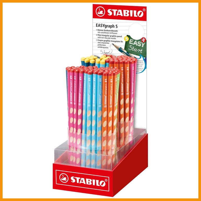 Stabilo Easygraph S on ergonominen lyijykynä, jonka kolmionmallisessa rungossa on sormien lipsumista ehkäisevät viisteet. Tässä runsaudensarvessa on esillepanoteline ja 90 lyijykynää, joista 75 kpl oikea- ja 15 kpl vasenkätisille.Kaikki STABILOn puiset kynät valmistetaan FSC- tai PEFC-sertifioidusta materiaalista.